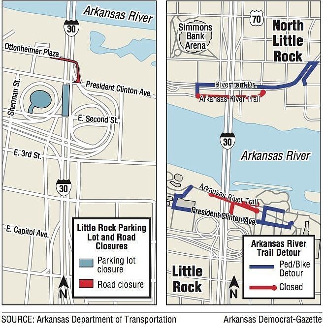 PULASKI COUNTY, ARK -- Crews performing pre-construction work along the Interstate 30 corridor in Little Rock will require road, parking lot and trail closures in Little Rock and North Little Rock, according to Arkansas Department of Transportation (ARDOT) officials. The most current traffic conditions can be found on iDriveArkansas.com or on the iDriveArkansas app.